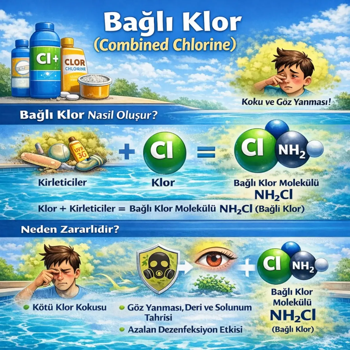 Havuz suyunu dezenfekte etmek için eklediğimiz klor, sudaki bakteri, virüs ve organik kirleticilerle (ter, idrar, vücut yağları) tepkimeye girer. Klorun bu kirleticilere "yapışmış" haline Bağlı Klor denir. Bağlı klor artık dezenfekte etme özelliğini yitirmiş, pasif bir klordur. Koku, göz yanması gibi sorunlara yol açar. Göz yanması ve o keskin koku, havuzun temizlenmeye ihtiyacı olduğunun işaretidir. Havuz suyunun klorlanmasındaki temel amaç hastalık üreten mikroorganizmaları etkisiz hale getirmek veya yok etmektir. Serbest klor ve bağlı klorun toplamı bize havuzdaki Toplam klor değerini verir. Sağlıklı bir havuzda bağlı klor seviyesinin 0.2 ppm altında olması gerekir.